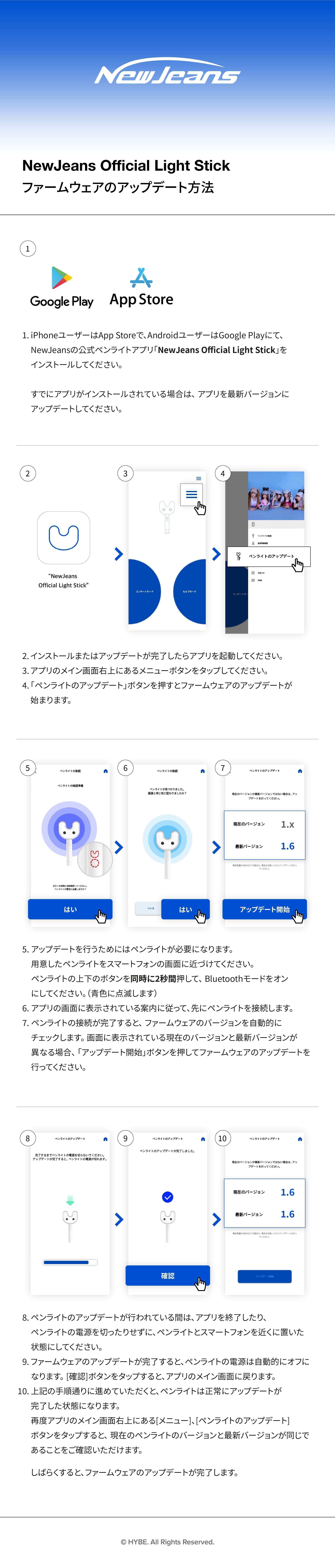 本公演に関するペアリングおよび座席登録に関するお知らせは後日改めてご案内させていただく予定ですが、アップグレードされた公演演出のため、NewJeans Official Light Stickのファームウェアを事前に最新バージョン(ver.1.6)にアップデートしていただきますようお願いいたします。